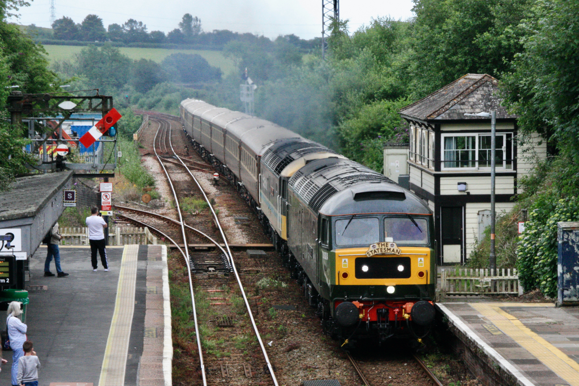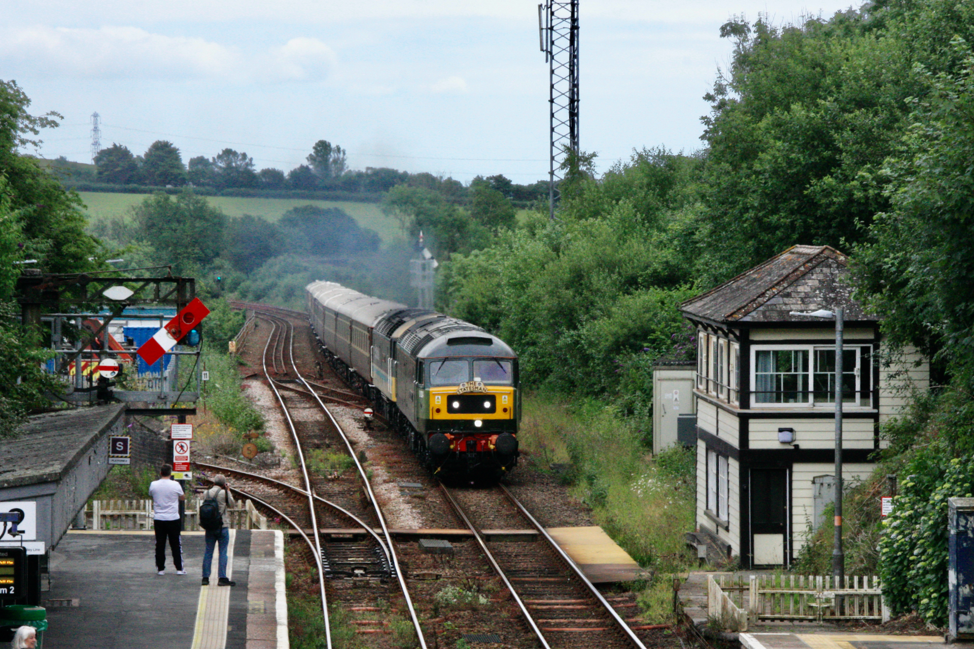 Making up for my Class 50 disappointment, the Class 47-worked service made a magnificent sight as it stormed through Liskeard on its lengthy run from Wolverhampton (05.20), having called en route at Stourbridge Junction, Kidderminster, Droitwich Spa, Worcester Shrub Hill, Cheltenham Spa, Cam & Dursley and Bristol Temple Meads.