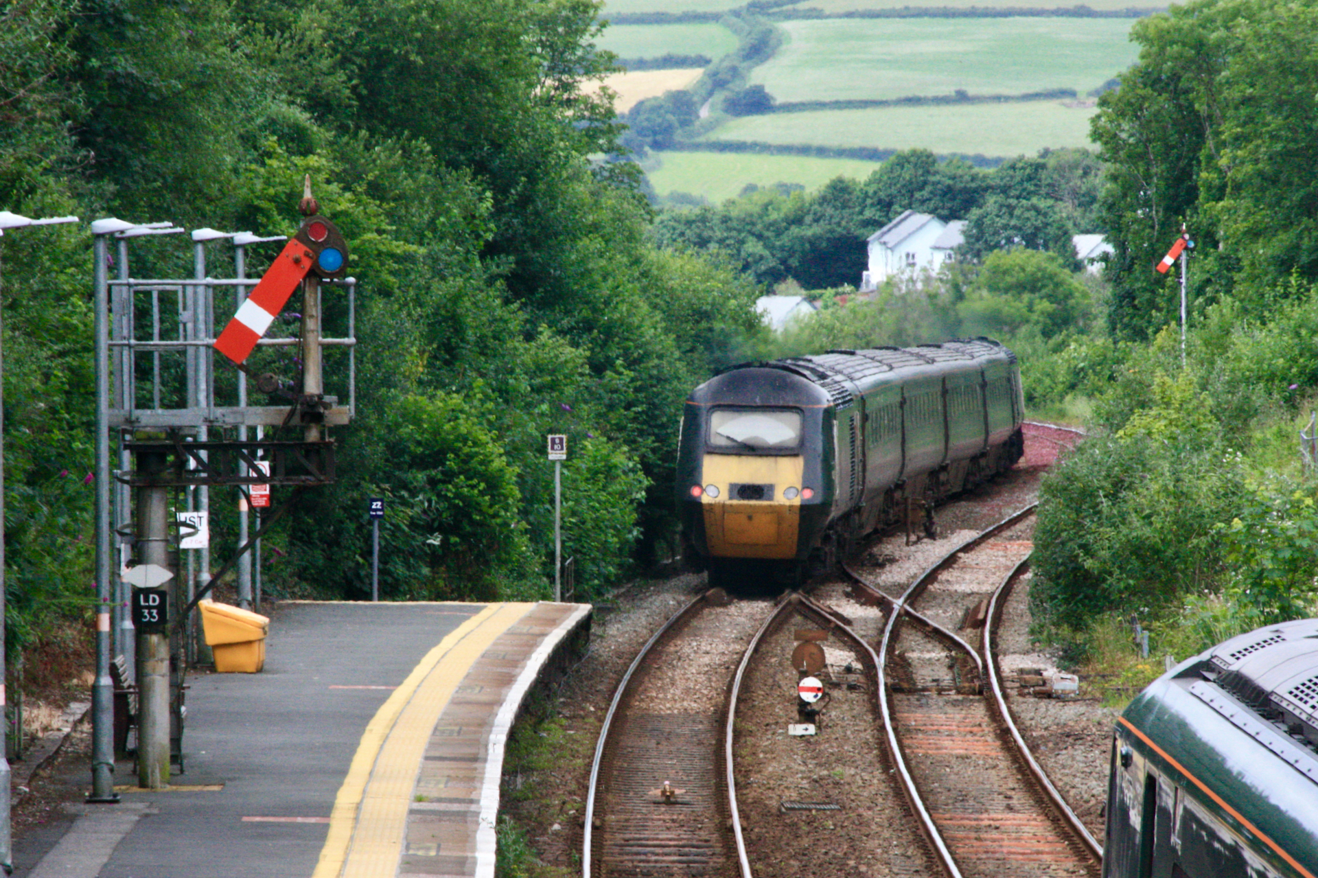 In the up direction, outer home signal LD2 stands out of view near Moorswater Viaduct, with the only up semaphore signal visible from the station being home signal LD3, a wooden-armed centre-pivot signal standing on the up platform that is one of only five surviving examples on the national network, along with those at Droitwich Spa, Malvern Wells, Shrewsbury and Worcester Shrub Hill.