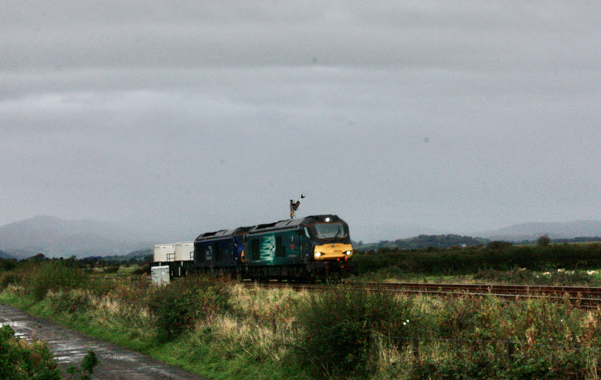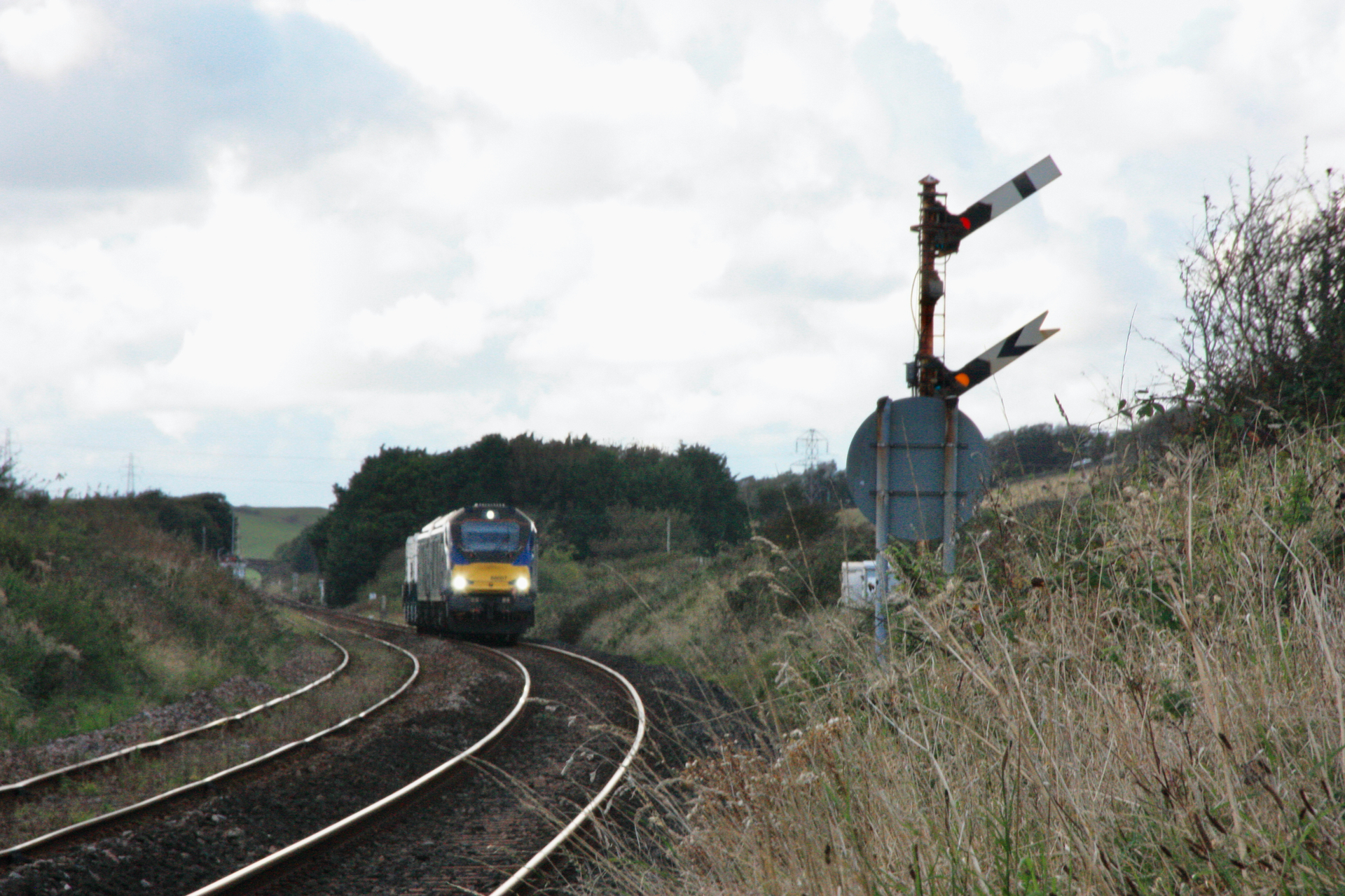 I had previously been told that this distant signal was only pulled off for trains like the nuclear working not scheduled to call at Millom, yet only a few minutes before the pair of DRS Class 68s appeared the distant had been pulled off for the heavily-delayed passing of 156440 on a Barrow-Carlisle working (2C41), running 44 minutes late.