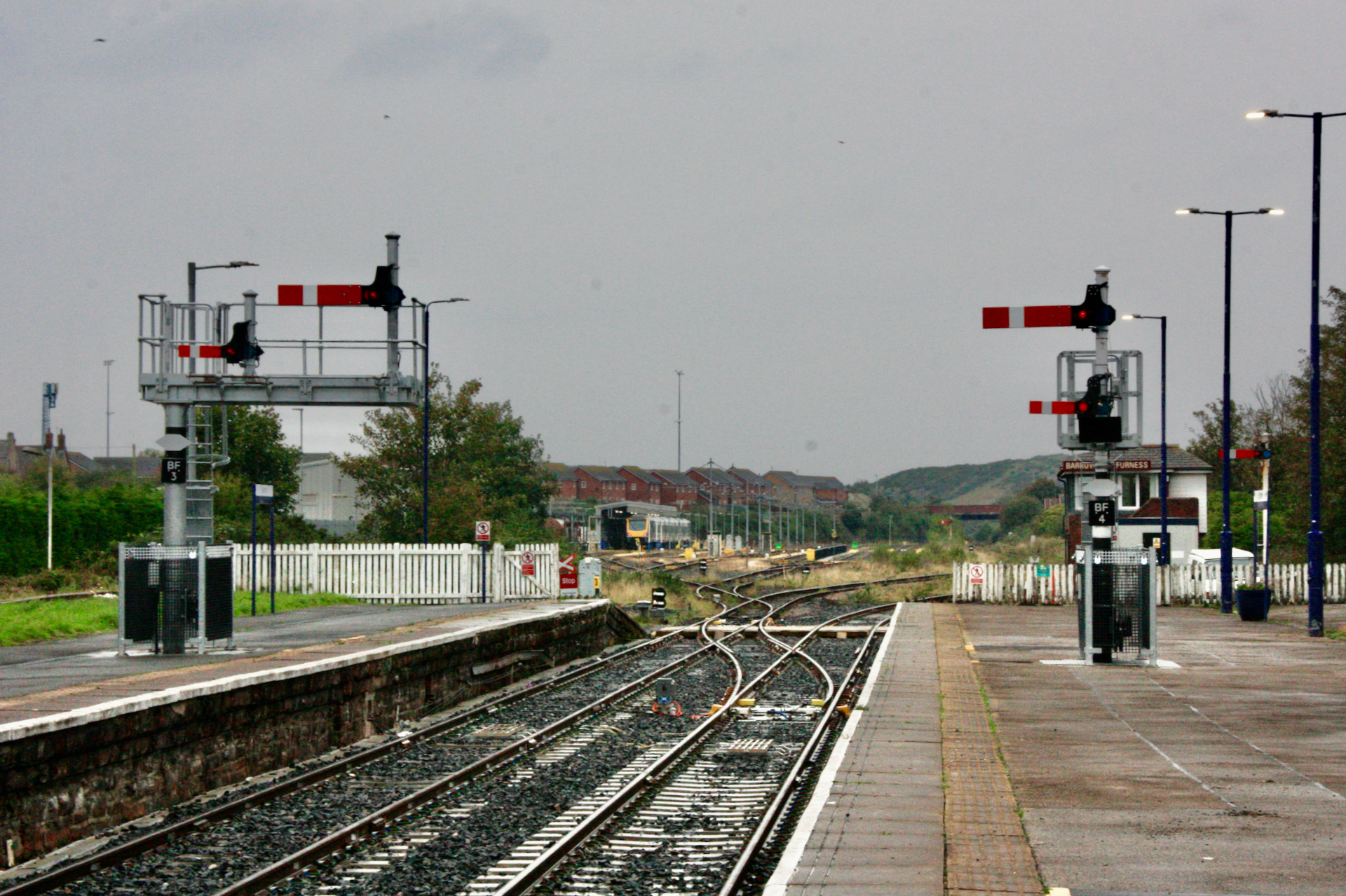 The up home and distant signals protecting Limestone Hall Level Crossing can just be seen from the platform at Silecroft, but it is well worth a 20-minute walk along the A5093 to get to Limestone Hall Level Crossing and have a better view.