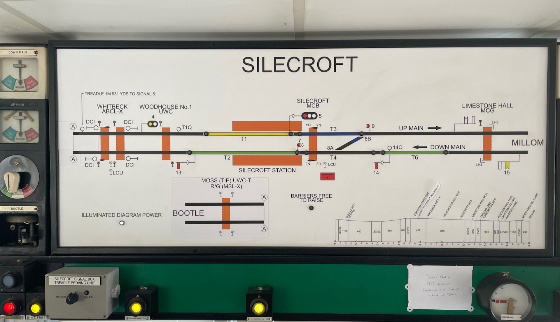 From Wigton I then caught the train on to Silecroft, the stop before Millom and a very quiet spot, with a 1923 Furness Railway signal box just south of the down (northbound) platform. This controls level crossing barriers and a trio of semaphores, all in the down direction. These are ST15, a distant signal at Limestone Hall LC, home signal ST14 close to the station and section signal ST13 400 yards to the north.