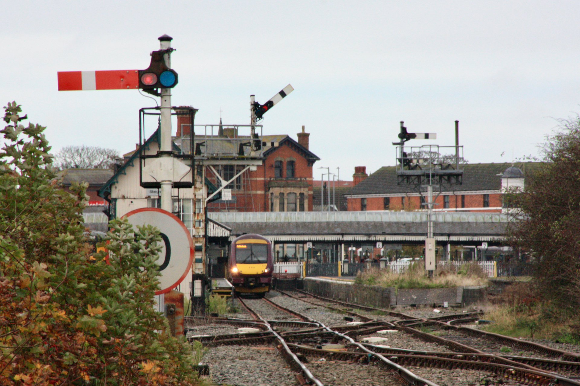 As on that occasion, the UTU and RHTT’s arrival meant the rare sight of two services in the station at the same time and, for the best vantage point, I once again made for a foot crossing of the line someway south of the station, behind a large Tesco store, from where there is a great view of the station, signal box and the semaphores it controls.