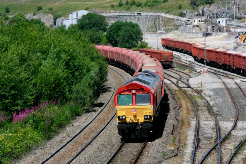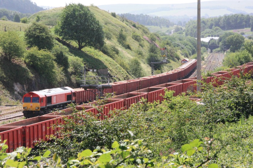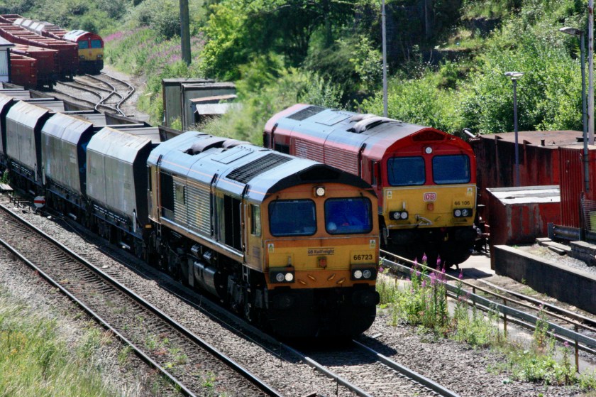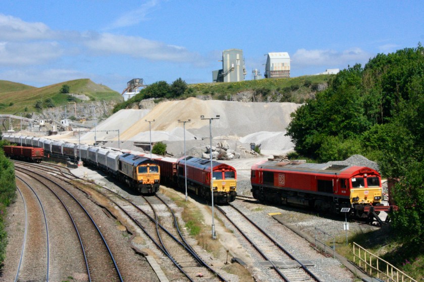 During the couple of hours I spent at Peak Forest that was the only working to head north from Great Rocks, although there was plenty of other action to savour, mainly involving orange liveried DB Class 66 locos, but along with Freightliner there was one other operator represented, when GBRf 66723 emerged from the Cemex quarry and latter departed with its trainload of aggregates bound for Selby.