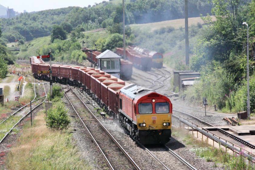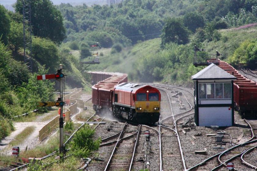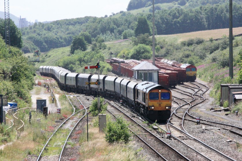 Peak Forest is a great place to observe heavy Class 66-worked freight trains departing and arriving at what is one of only two locations I am aware of where mechanical signalling controls exclusively freight traffic, Crag Hall on Teesside being the other.