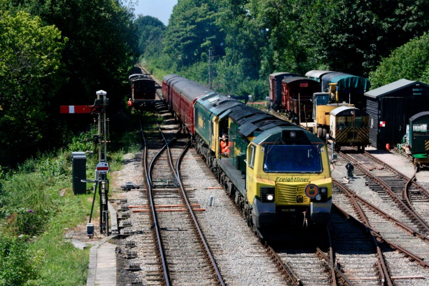 Besides this heritage trio, another remarkable sight during my time on the Medstead station footbridge was a pairing of modern day traction, in the shape of Freightliner 70002/66533, hauling the preserved former Southern Region 4TC coach set.