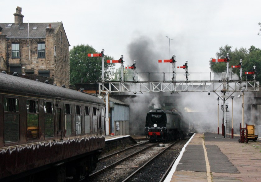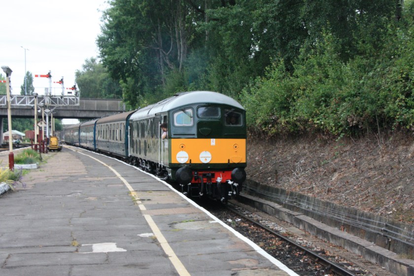 With the Pacer unit thankfully stood down on 22 August, the second service on that day was formed of Mk1 coaches, as was the set being hauled by 34092, and was being hauled by Class 24 loco 24054 (D5054) painted in its original BR green livery and masquerading as its scrapped classmate, D5053 (24053).
