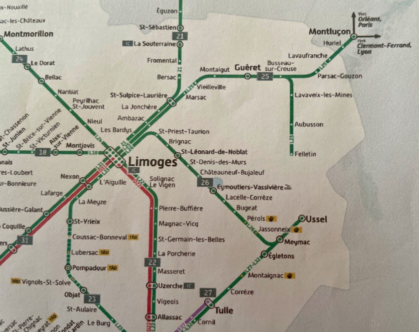 As this extract from the Nouvelle-Aquitaine rail map shows, the Felletin branch diverges from a route heading north-east from Limoges to a town called Montluçon, so for a spot of new French rail mileage I decided to take a trip there (Friday, 29 August 2025) on one of only two trains a day to cover this route, with the return service getting me to Busseau-sur-Creuse in time to capture the afternoon Felletin-Limoges service crossing the magnificent viaduct there.