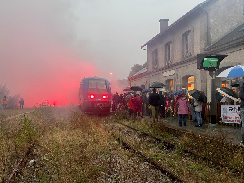 That total was swelled by four joiners at Lavaveix-les-Mines and eight at Aubusson, including the town’s mayor, leaving a total of 36 aboard for our arrival into Felletin, where we were greeted in torrential rain by detonators, fireworks and a huge demonstration of more than 100 anti-closure campaigners, including three local mayors.