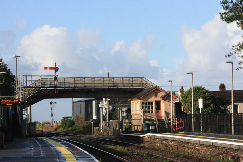 There is a similar pattern at Ferryside, where its Grade II-Listed signal box has three semaphores in the down direction, comprising FS21 (minus its finial) alongside the sea wall just south of the station and box, starter FS20 and section signal FS21 to the west of the station platforms. In the up direction, there are outer home FS2 and inner home FS3, opposite the signal box.