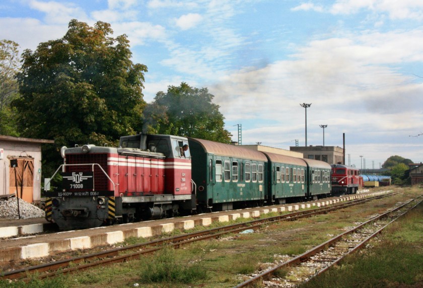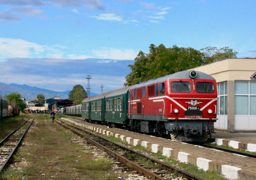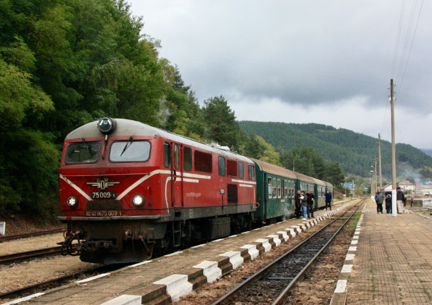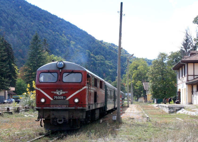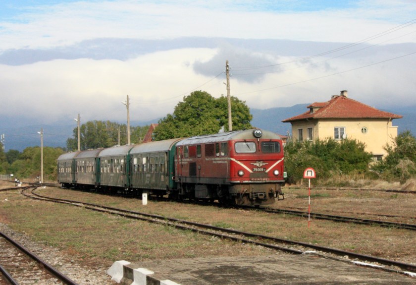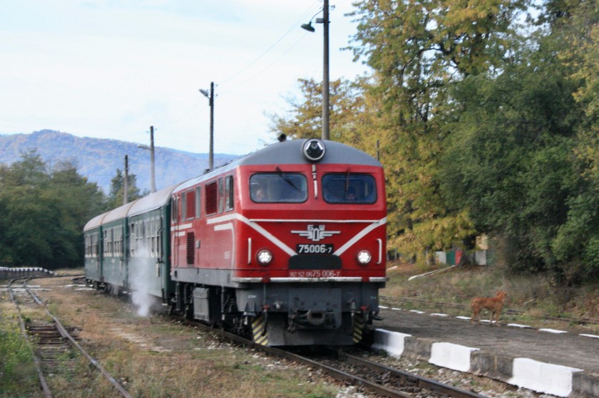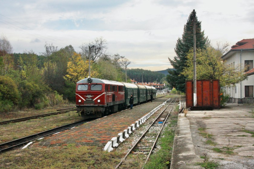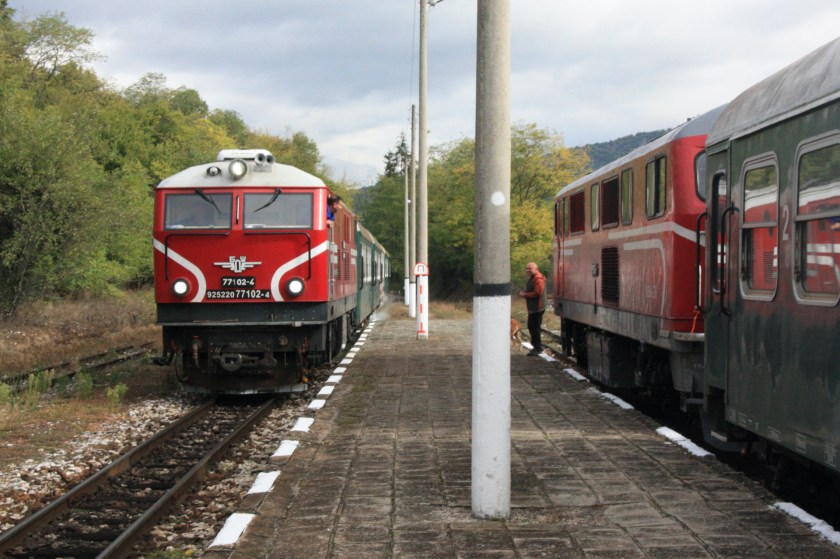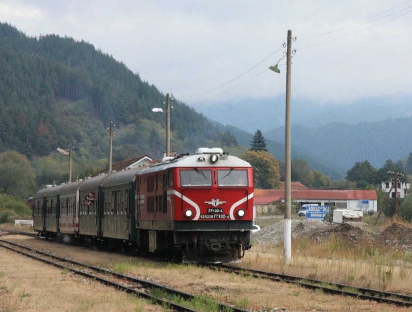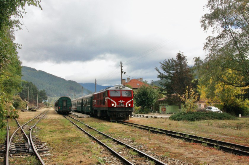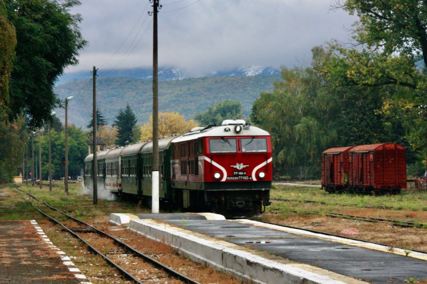 The first of these modernised locos (77-102) powered the crack Rodopi express on all four days of my visit, but there was considerable rotation of motive power on the slower regional services, which comprise three other full length trips, taking almost five hours, along with a short early morning working from a remote station called Tsvetino, via Velingrad to Septemvri and an evening return from Septemvri to Velingrad.