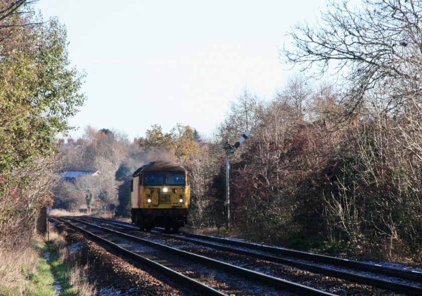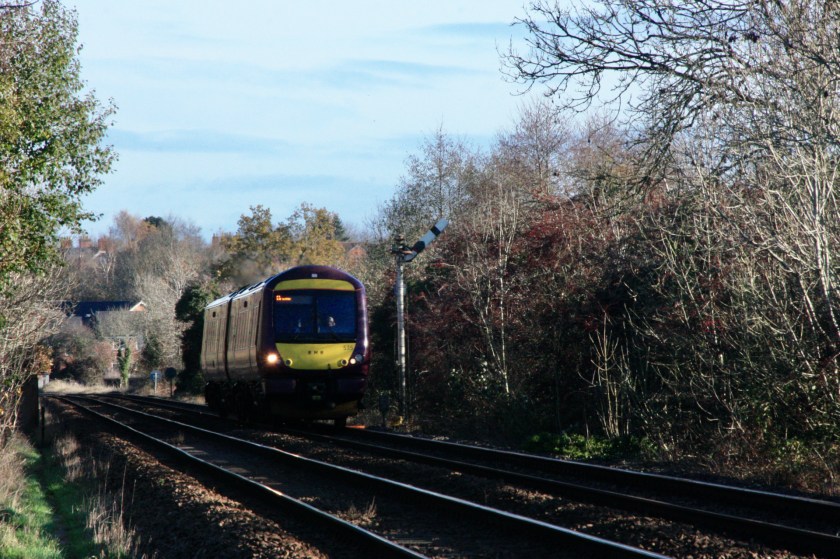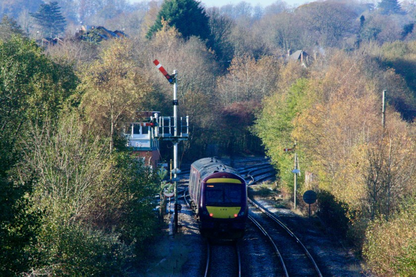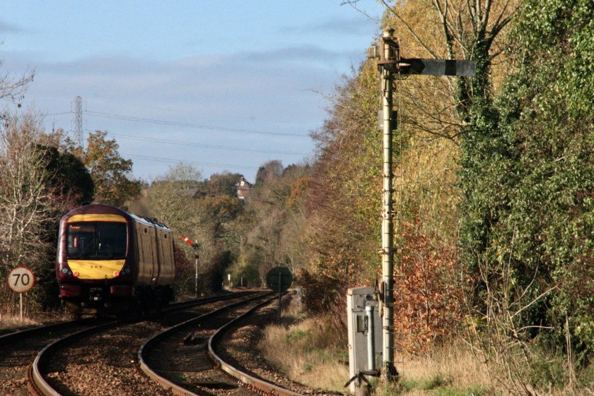 Among the ten semaphores are two working distant signals, UR1 in the down (westbound) direction and UR40 on the up line. On my previous visit I had looked in vain for a spot west of the town from which to photograph UR40, but had found a spot alongside the racecourse, east of the station, from which to capture trains passing UR1.