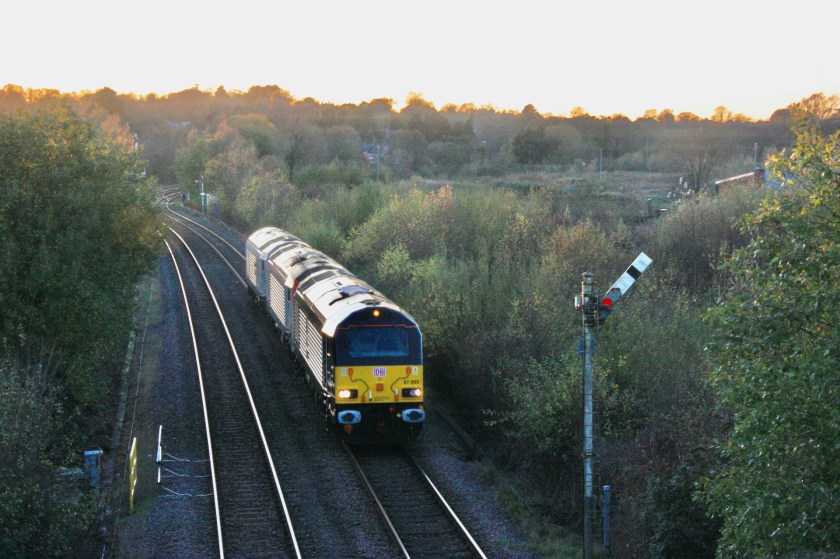 On the western edge of the town, another good vantage point is Hockley Road level crossing, controlled by Uttoxeter Signal Box, which stands out of sight round a left hand bend, but is only 400 yards away. Here there is a wooden fence which it is possible to sit on and photograph services passing signals UR39 (up outer home) and UR5 (down section signal).