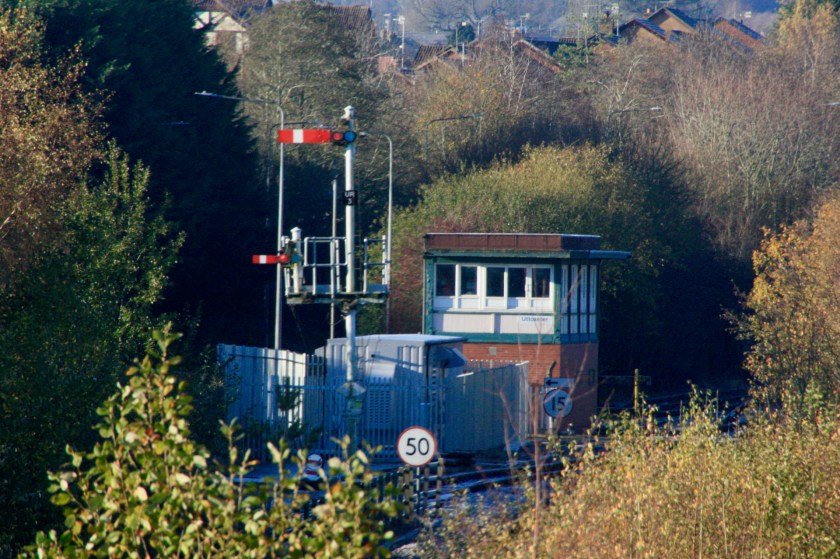 These ten signals are unique on our rail network in representing a complete set of semaphores in both directions, and comprise on the down line UR1 (distant), UR2 (outer home), UR3 (home), UR4 (starter) and UR5 (section), while in the up (eastbound) direction you will find UR40 (distant), UR39 (outer home), UR38 (home), UR37 (starter) and UR36 (section).