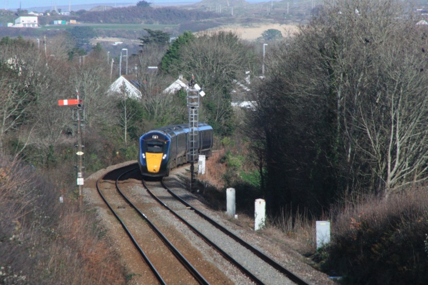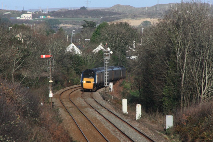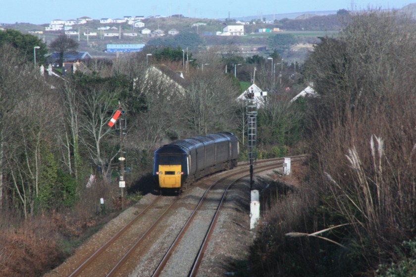 Arriving into St Erth station in bright sunshine at 13.00 on 12 December I took a brisk 15 minute walk to Rosengrouse Road over-bridge (321m 46.25ch) from where I was able to photograph two of the day’s three Castle sets (GW06 and GW09) passing Britain’s most south-westerly semaphores, down section signal SE7 and up outer home signal SE68.