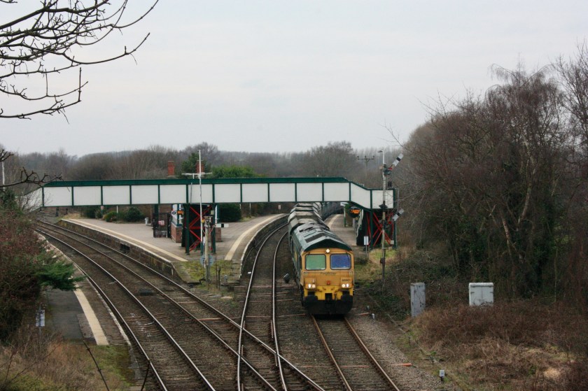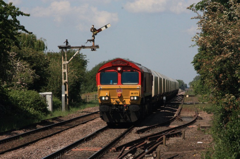 I made my farewell visit to Manea on 12 May, a fine sunny day, but one where there were some issues with the signalling at Ely, meaning trains being instructed to pass up section signal M21 at danger. My pick from that day shows DB 66073 approaching the station with 6L42 from Mountsorrel Sidings to Barham.