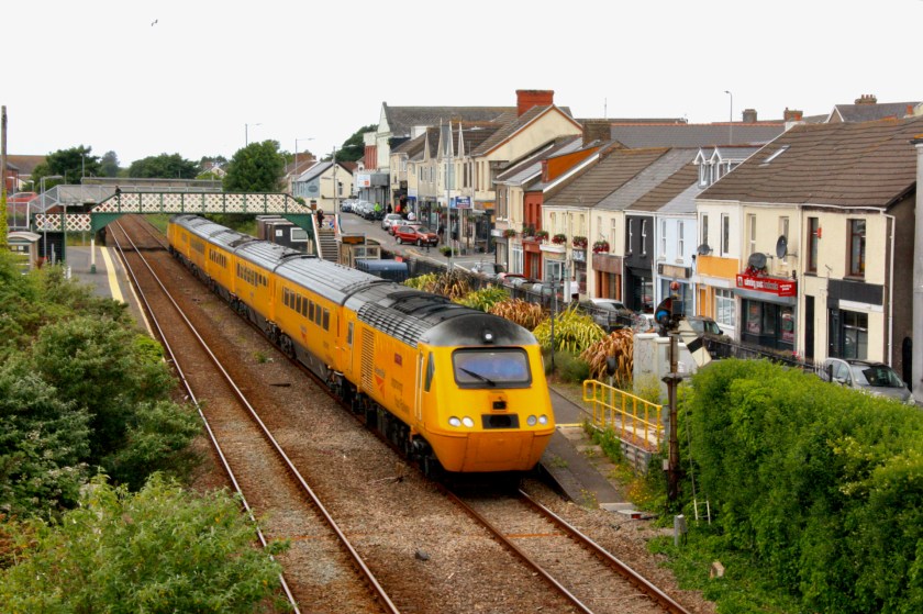 Returning to Pembrey & Burry Port on 4 June, less than six months before the semaphores were removed, my aim was to capture the Network Rail “flying banana” test train passing the doomed signals and my pick from that trip is this view (above) of 43013/062 passing the station with test train 1Q16 after its monthly tour of West Wales.