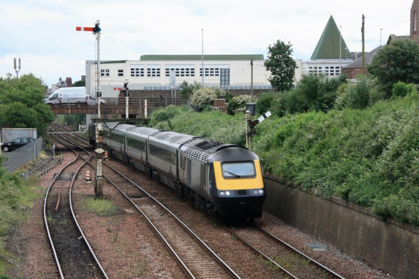 A fortnight later I was north of the border and paying a return visit to Arbroath, another fine location for mechanical signals and home to a remarkable and Listed signal box. My pick from that 18 June trip shows a ScotRail Inter7City HST powered by 43146/168 departing with 1A39 from Glasgow Queen Street (10.41) to Aberdeen.