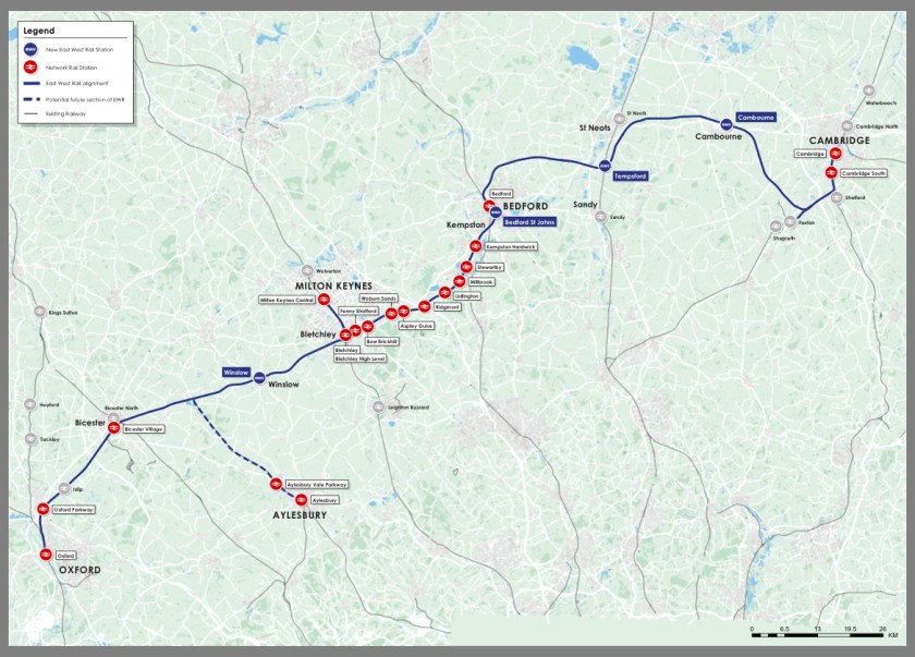 There are some contentious local planning issues as to how the new EWR will pass through Bedford, while heading eastward from there the route will follow a totally new alignment, as the original route has been lost to development over the past half century, and will include a station to serve a planned new town at Tempsford, which will also create an interchange with the East Coast Main Line.