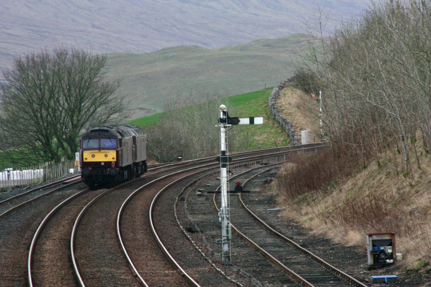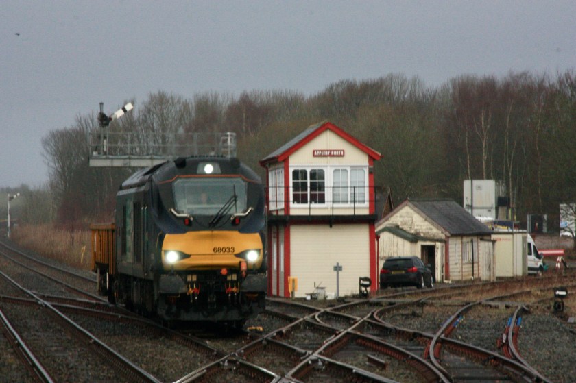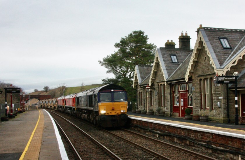 But one regular performer is 6K05, a departmental working from Carlisle to Crewe Basford Hall, that produces a variety of motive power and load from day to day. On 12 January I captured it at Appleby being worked by a DRS Class 68 with a featherweight load of just one wagon, while two days later I saw the same working at Kirkby Stephen being powered by a trio of Class 66 locos.